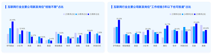 根据报告,2023年至2025年间,头部互联网公司在脉脉站内发布的社招岗位中,“不限经验”以及“3年以下经验可投递”的比例持续上升。以字节跳动为例,不限经验岗位的占比上升至 20%。据此前消息,字节跳动将毕业3年内岗位招聘量扩大一倍,腾讯游戏启动面向工作经验在0-3年的社招专项,小红书拓宽校招毕业年限。越来越多企业正在主动打破“经验”“年龄”“资历”等固有门槛,转而以真实能力作为招聘的核心标准。