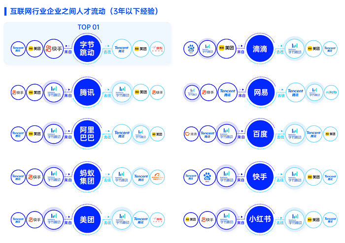职场新人在选择公司时,也呈现出明确的倾向:脉脉的这份报告分析了互联网大厂间的人才流动,字节跳动是工作经验在3年以下的职场新人跳槽时的首选公司,顶尖人才的流动去向同样以字节跳动为主。分职类来看,研发人才倾向超级大厂,近半成受访者倾向腾讯和字节跳动,品牌人才想去小红书。除跳槽外,在选择第一份工作时,校招生表示最想加入字节跳动,其次为腾讯和阿里巴巴。