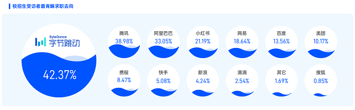 报告显示,互联网行业的招聘趋势正在打破经验限制,从“看资历”到“看能力”,同时,职场新人的自主性正在增强,更加注重真实能力的提升,希望去往能提供更大成长空间和授权的企业。在公司选择上,工作经验在3年内的职场新人和顶尖技术人才的主要流向均为字节跳动。校招生群体中,超过42%的受访者表示第一份工作最想加入字节跳动,其次为腾讯和阿里巴巴。