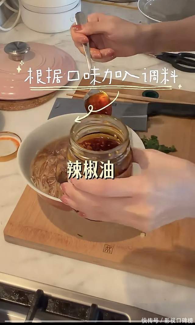 董洁还特意加了辣椒油,葱花、香菜。可见,她对吃还是挺有讲究的。
