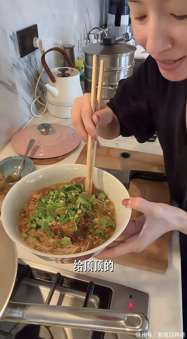 视频的最后,董洁一大早起床做早餐。就是昨天做好的红烧牛肉加热,煮了一碗面。