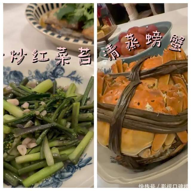董洁将顶顶(儿子)接回家后将做好的一桌菜肴端上饭桌,有红烧牛腩,红烧带鱼、辣椒炒肉、清炒红菜苔、清蒸螃蟹,十分丰盛。隔着屏看到都想吃,顶顶一定吃得很香。
